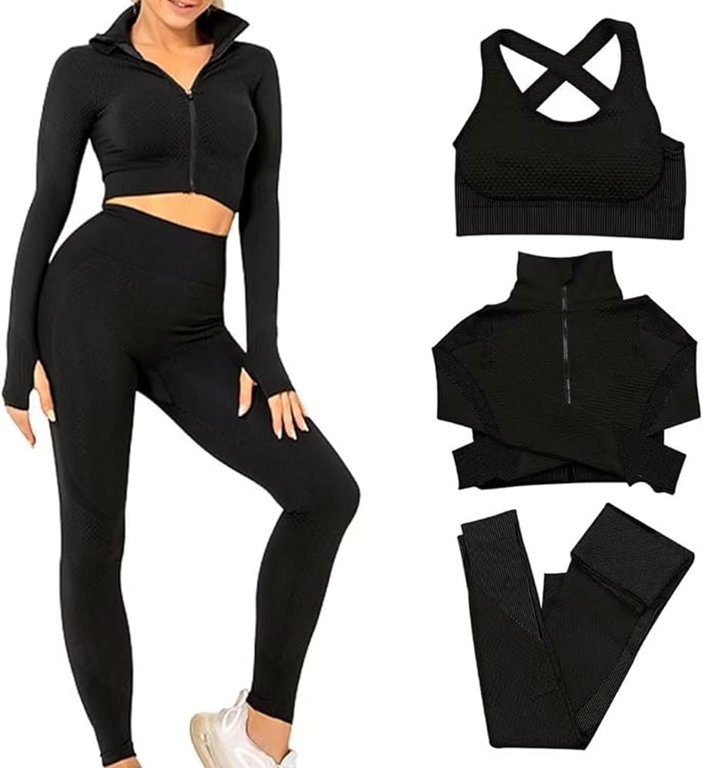 - Three-piece sportswear set: ‘s sportswear trio is a versatile set comprising a zip-up crop jacket, seamless sports bra, and high-waisted leggings. Crafted from premium polyester and spandex, it offers breathability, flexibility, and stretchiness. PLEASE NOTE THAT THE SET RUNS SMALL, SO IT IS RECOMMENDED TO CHOOSE ONE SIZE LARGER THAN YOUR USUAL SIZE FOR A BETTER FIT.